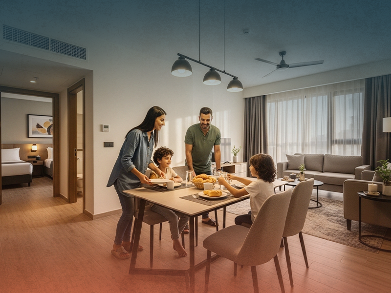 توفر الشقق الفندقية مساحة أكبر، خصوصية أعلى، مطبخًا مجهزًا بالكامل، ومرونة أكبر في مدة الإقامة مقارنة بغرف الفنادق التقليدية.